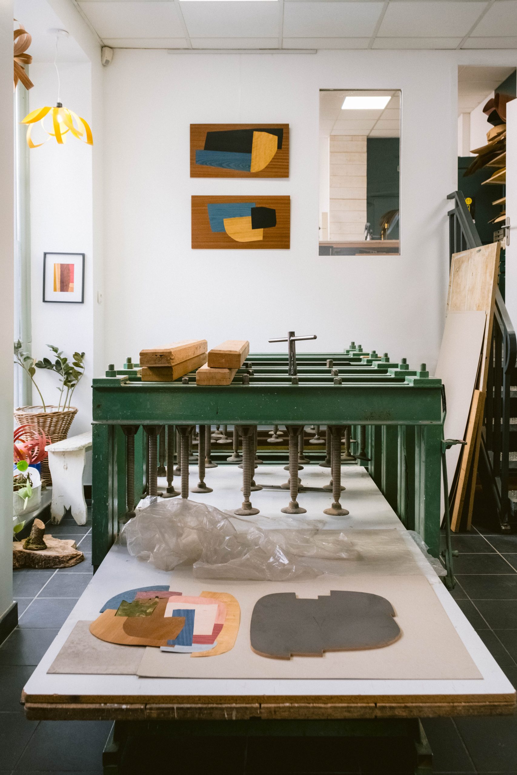 Dans son atelier d’artisanat d’art, Marie Dubois réalise des tableaux en marqueterie de bois contemporains et abstraits.